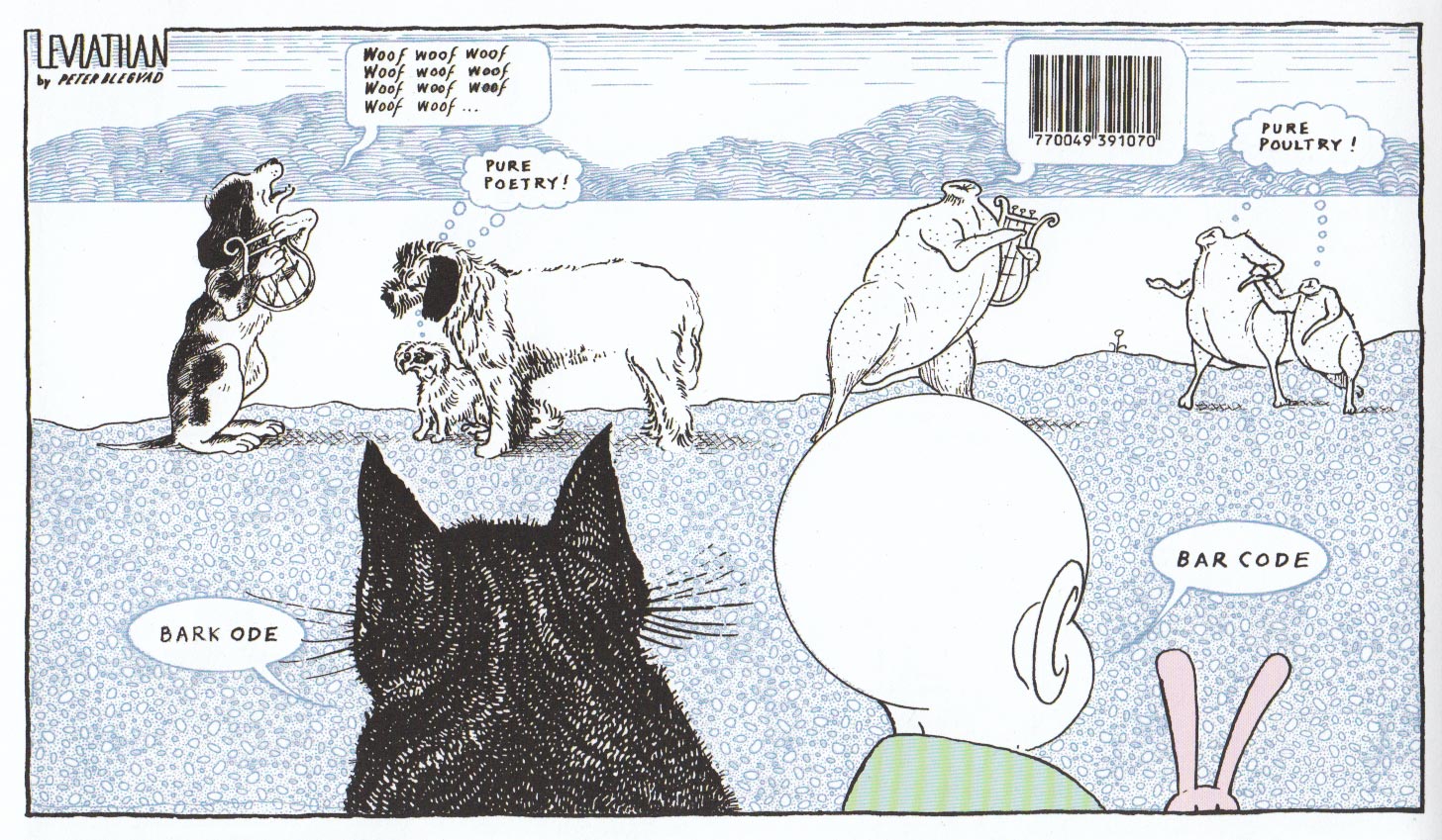 Es ist dieses ständige Spiel von Widersprüchen, Sinneseindrücken, Literaturzitaten, Anspielungen auf Kunst und Philosophie, die so simpel dargestellt sind, dass es sogar ein Baby versteht. Hinzu kommt, dass die Form des Strips und die Anzahl der Panels von Woche zu Woche von Blegvad gewechselt wurde. Abschließend sei noch ein ganz simples Beispiel aus Book of Leviathan angeführt, um zu zeigen, dass der Comic keine schwere Kost ist und jede Comicsammlung nur beflügeln wird.