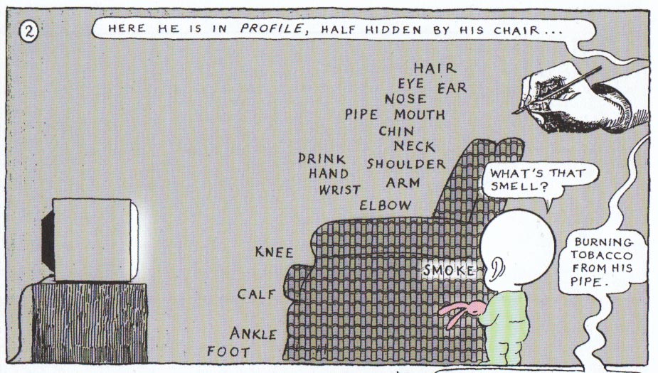 Die Protagonisten dieser Geschichte sind das Baby Leviathan, das dem Comic freundlicherweise seinen Namen ausgeliehen hat, und eine Hand mit Stift, die eher einem Symbolbild oder einem Terry Gilliam-Prop entspricht. Beide „Figuren“ können sprechen und tun dies in recht simpler Art und Weise. Die Sätze als solche sind einfach zu verstehen: „Here he is in profile, half hidden by his chair …“ Worauf Levi fragend antwortet, „What’s that smell?“ Die Auflösung ist die Fortsetzung des oben begonnenen Satzes: „burning tobacco in his pipe“. Der Unterhaltung zu folgen, bedarf keiner großen Mühe, doch über was unterhalten sich die beiden?