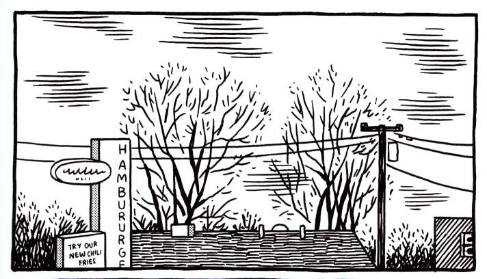 Nur selten arbeitet Huizenga mit Farben. Ein Grund dafür ist sicherlich sein Werdegang als Autor von Minicomics. Aber gehen wir gleich zu dem schwarz-weißen Panel über. Was wir sehen, erinnert auf den ersten Blick an Robert Crumbs A Brief History of America. Ein amerikanisches Idyll mit einem Telefonmasten, inklusive Leitungen, einem Dach, exklusive Haus, zwei Bäumen, die nur skizzenhaft angedeutet sind, und einem Himmel, dessen Wolken zu verschwimmen drohen.