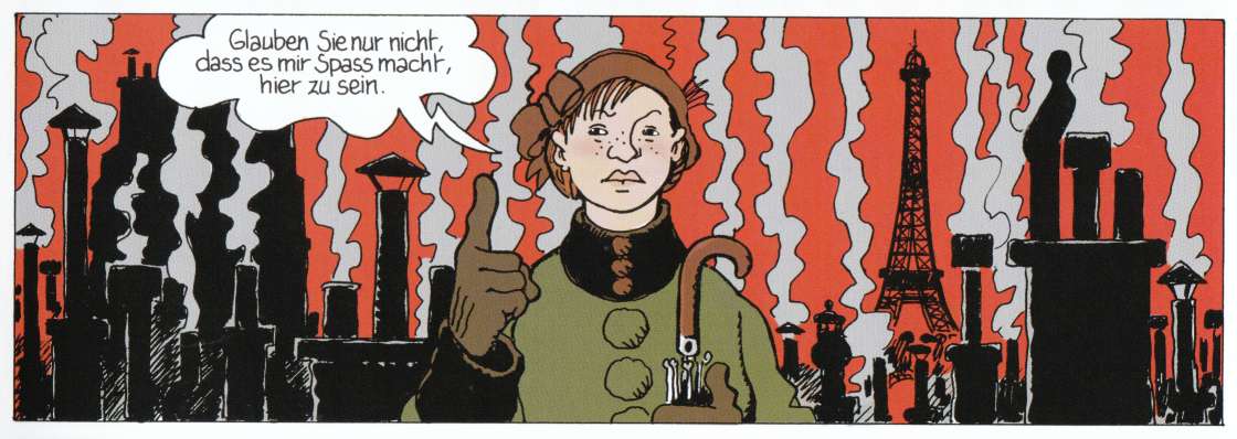 Bei genauerem Hinsehen zeichnen sich die schwarzen Gebilde als Schornsteine ab und die grauen Linien als aufsteigende Rauchschwaden. Der Rauch alleine verrät schon die Handschrift des Comickünstlers, aber ich will nicht vorgreifen. Bleiben wir auf den Dächern zwischen diesem Sammelsurium von Schornsteinen. Es handelt sich offensichtlich um eine größere, dicht bevölkerte Stadt. Schnell wird deutlich, um welche europäische Metropole es sich handelt: Paris. Nahezu scherenschnittartig ragt zwischen den Schornsteinen das Wahrzeichen der Stadt hervor, der Eifelturm.