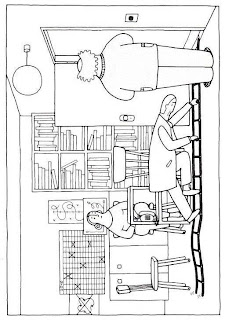 Betrachtet man ein Panel, geht man im Normalfall davon aus, dass sich alle Figuren und die Requisiten an die gleichen physikalischen Gesetzen halten. Im Beispielpanel sieht die Sache anders aus: Im rechteckigen Panel sehen wir drei Figuren. Die Majorität der Charaktere scheint Gefallen an der perfiden Situation mit der Schwerkraft gefunden zu haben. Einzig die Figur in der Mitte verhält sich korrekt der newtonschen Gesetze und bedarf einer Strickleiter, um die vertikale Distanz von der Tür zu ihrem Sitzplatz zu überbrücken.